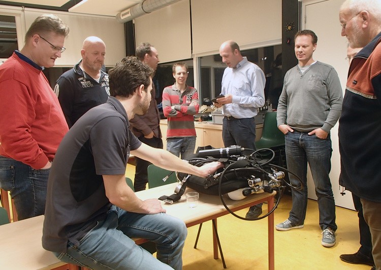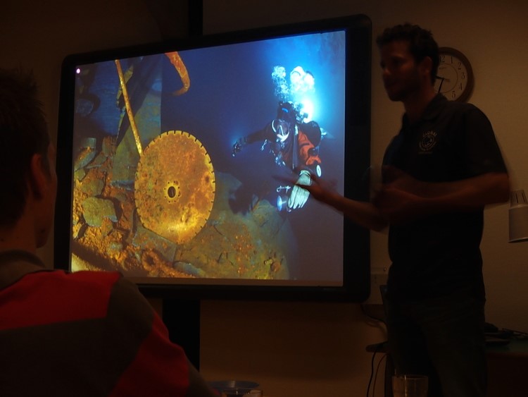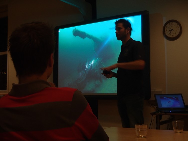 Daarna vertelde Sander nog over een aantal duiken in Noordwegen (Dornier watervliegtuig) en Frankrijk (Bristol Beaufighter) om vervolgens te eindigen met een duik als projectteam met een aantal duikers in Italië op het wrak van de Guizeppe Dezza, een mijnenveger die op een mijn liep en in tweeën brak. Het Nederlandse team met o.a. Sander en Rene hadden een Engelse duiker die software had ontwikkeld waarmee redelijk snel een 3d afbeelding van het wrak met behulp van al het foto materiaal gemaakt kon worden, aan het team toegevoegd. Het resultaat is verbluffend (zie Duiken nr 8 voor de foto's).