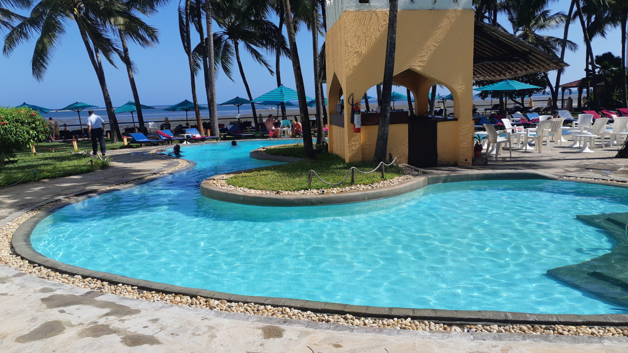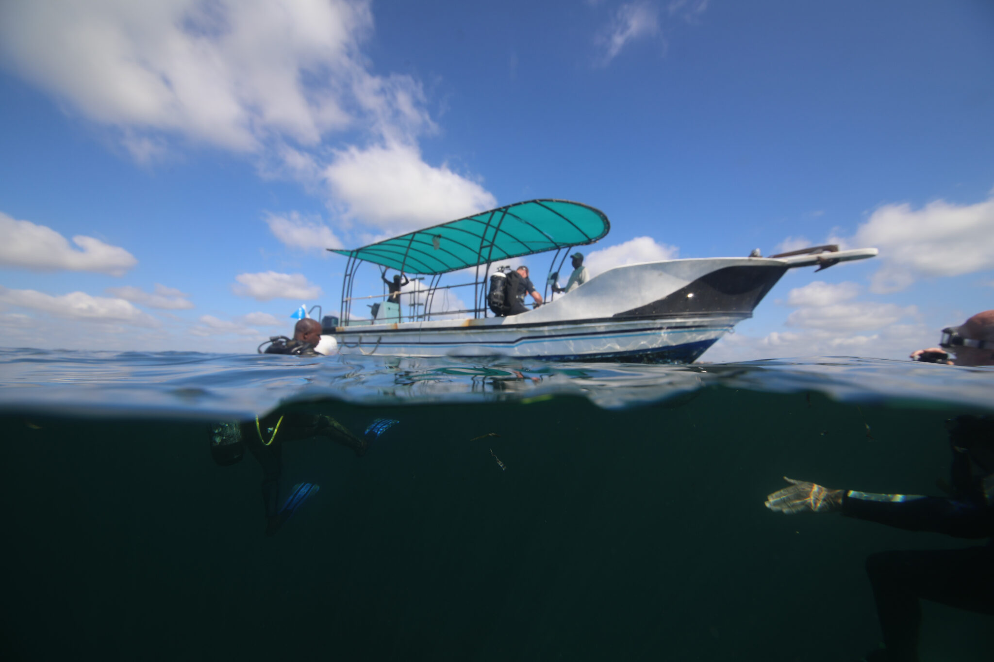 Tot onze verrassing bleek Kenia een buitengewoon groen land te zijn. Mombasa is een grote stad met uitgebreide sloppenwijken. Je merkt toch dat je diep in Afrika zit, met ook de meest donkere armoede. Het resort lag aan de rand van Mombasa op het strand. Keurig verzorgt, eten was prima en we hadden een regeling dat de nabij gelegen duikschool ons ’s morgens ophaalde voor de eerste twee duiken.