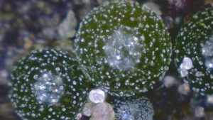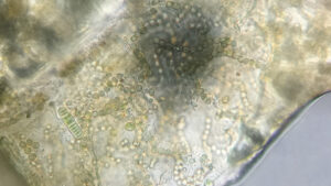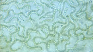Onder mijn microscoop heb ik een brokje van dat 'papier' gelegd, nadat ik dat maandenlang in huis had bewaard en weer nat gemaakt had. Nostoc leefde gewoon weer op en de vergroting van honderden keren laat de hoekige tot kettingen verbonden cellen weer zien. Hier en daar zie je ergens midden in de kettingen verdikte cellen (zogenaamde heterocysten) die luchtstikstof binden en vaak eindigen de kettingen in ronde cellen die de sporen zijn waarmee de kolonie in zijn omhulsel zich verspreiden kan (nat of droog? Nostoc maakt het niet uit).