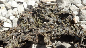 Kan het spul eigenlijk wel dood? Ik noemde het al, Nostoc verwordt tot papierachtige proppen. Die proppen zijn uiterst breekbaar, kunnen gemakkelijk verkruimelen en verwaaien. Maar wat geeft dat? Ook al is het stukje nog zo klein, ooit wordt het toch weer nat, waarop het weer opleeft, alsof het nooit weg geweest (en "dood" gegaan) is.