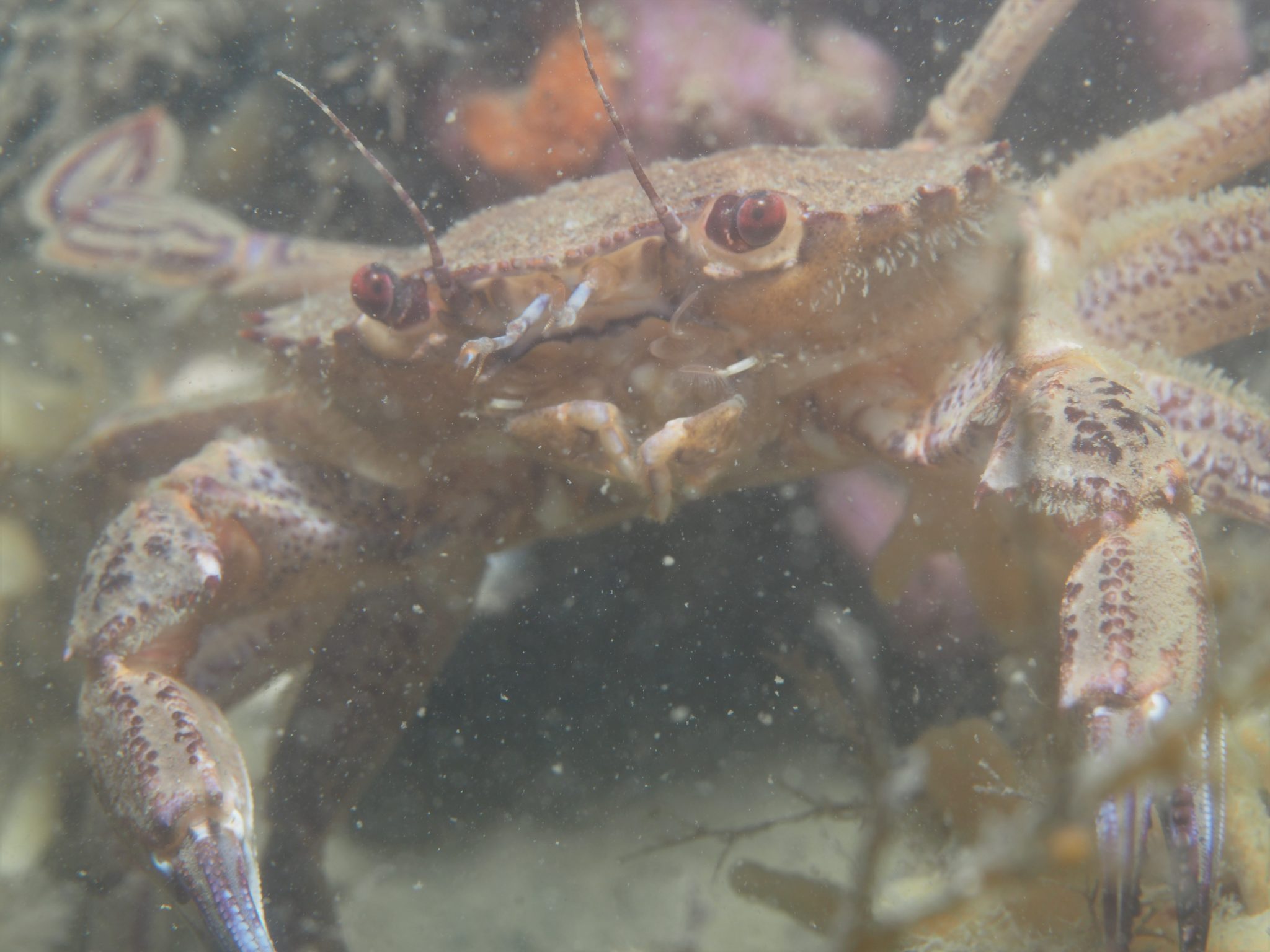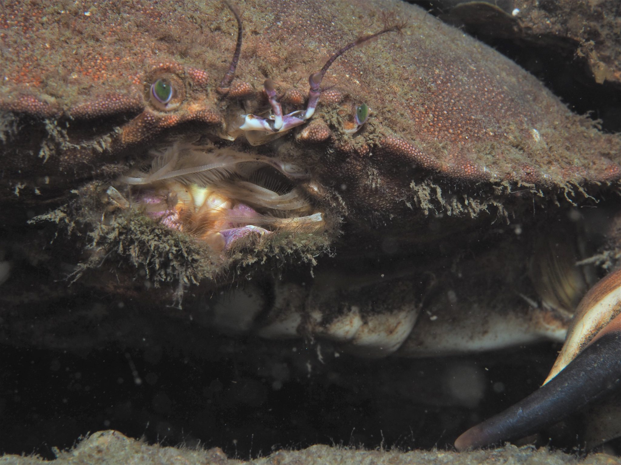 Opvallend onder water waren de grote hoeveelheden oorkwallen en uiteraard groene wierslakjes. Daarnaast zagen we sepiola, noordzeekrabben (volgens mij veel meer dan de afgelopen jaren), platvis zoals schar en bot (idem). Ook puitaal liet zich zien. Verder baltsende zandgrondel en fanatiek broedzorg biedende mannetjes van zwarte grondel. Verder zag ik af en toe mooie pauwkokerworm en blauwpoot zwemkrab.