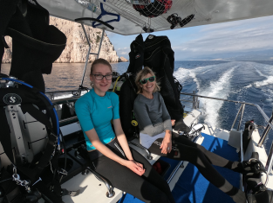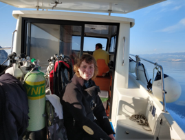 Er gingen ook wat Oostenrijkers mee op de boot. Jeltje heeft hier onder begeleiding van Paul haar eerste diepe en wrak duik gemaakt. Het was mooi helder onderwater en een redelijke temperatuur van 18 graden zelf op 25 meter diepte. Op het wrak zelf zaten veel mooie paarse slakjes genaamd violette draad slak. Er was ook een grote schorpioen vis gezien en veel krabben die zich hadden verstopt. Door dat we met een kleine groep waren konden we rustig kijken zonder elkaar in de weg te zitten.