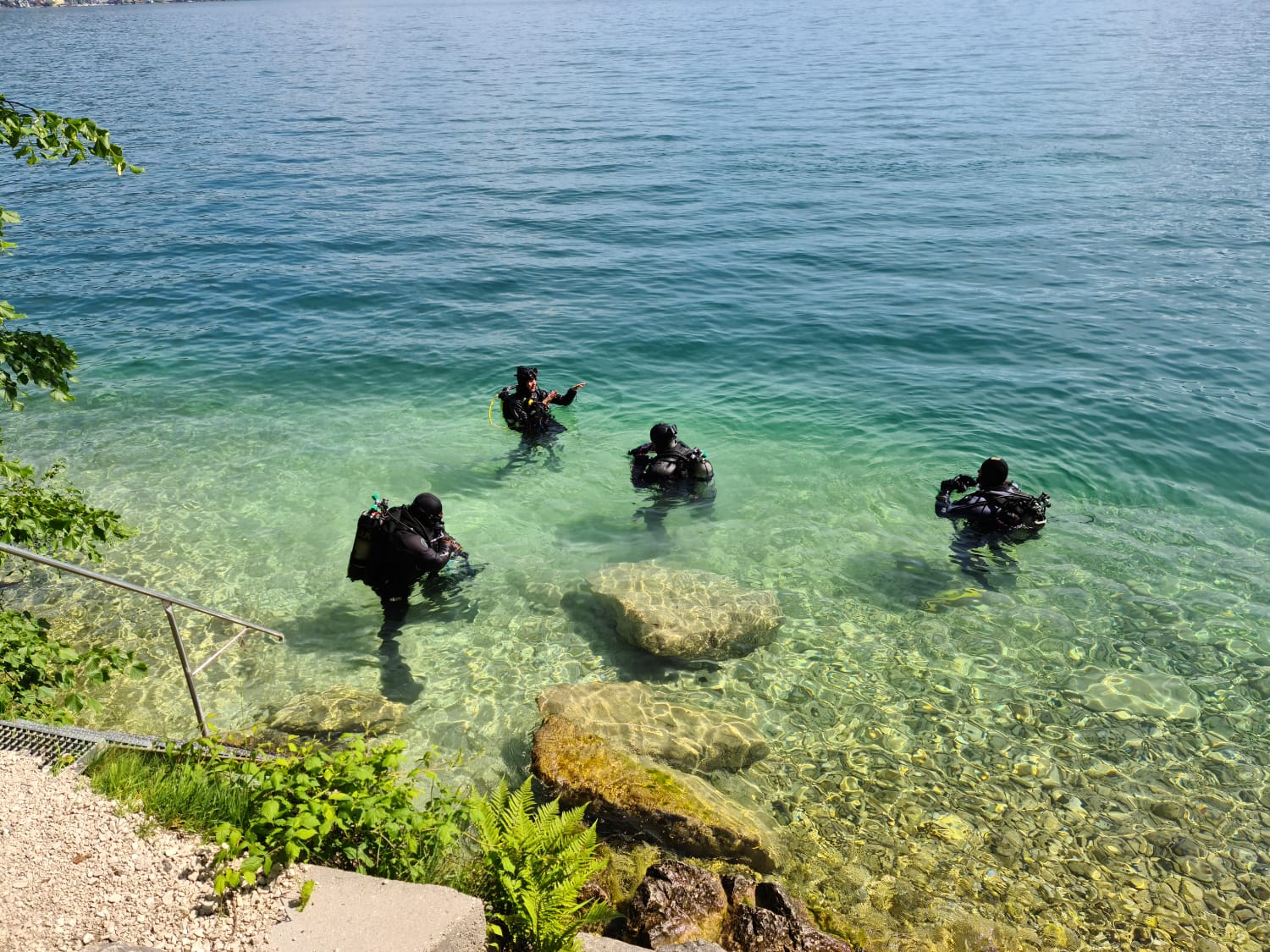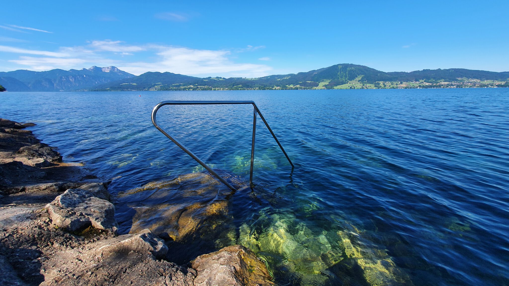 Dinsdag was de eerste duikdag, broodjes mee van de supermarkt en op weg naar de Attersee. Vanaf de parkeerplaats was het ongeveer 7 of 8 meter lopen naar de instap, dit was een stevige RVS trap. Later bleek dat er meer dan 30 van deze duikstekken, alleen al bij de Attersee, te zijn en allen voorzien van een goede makkelijk te bereiken instap, informatie bord en het belangrijkste misschien wel, helder water met goed zicht!