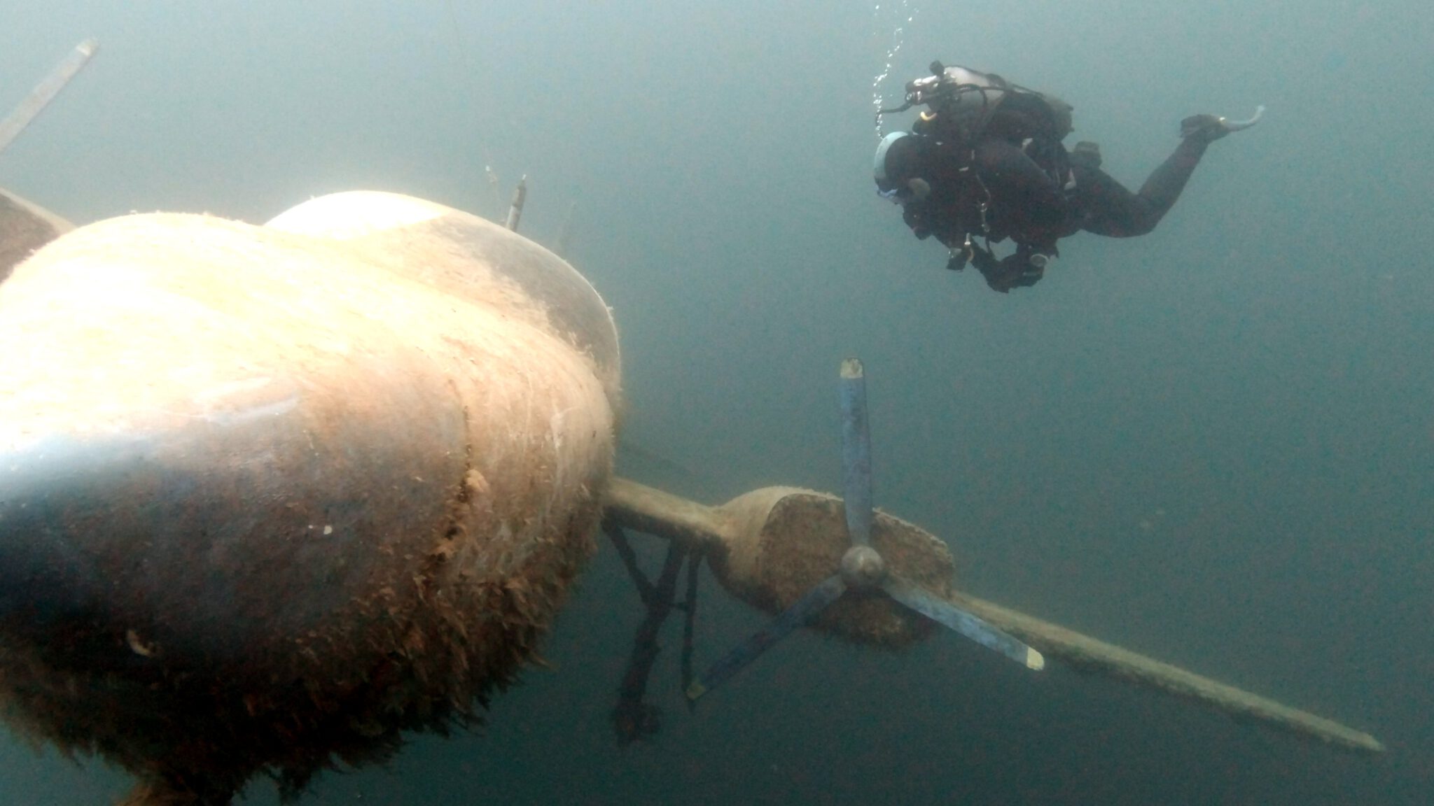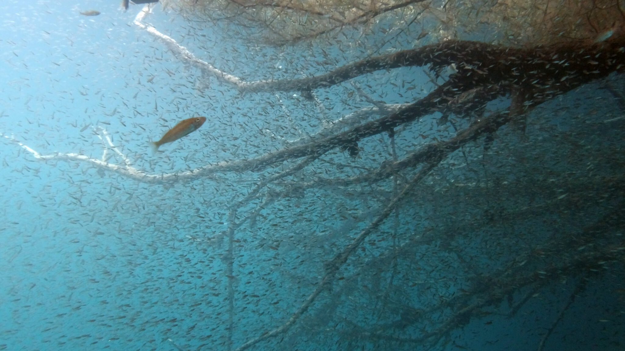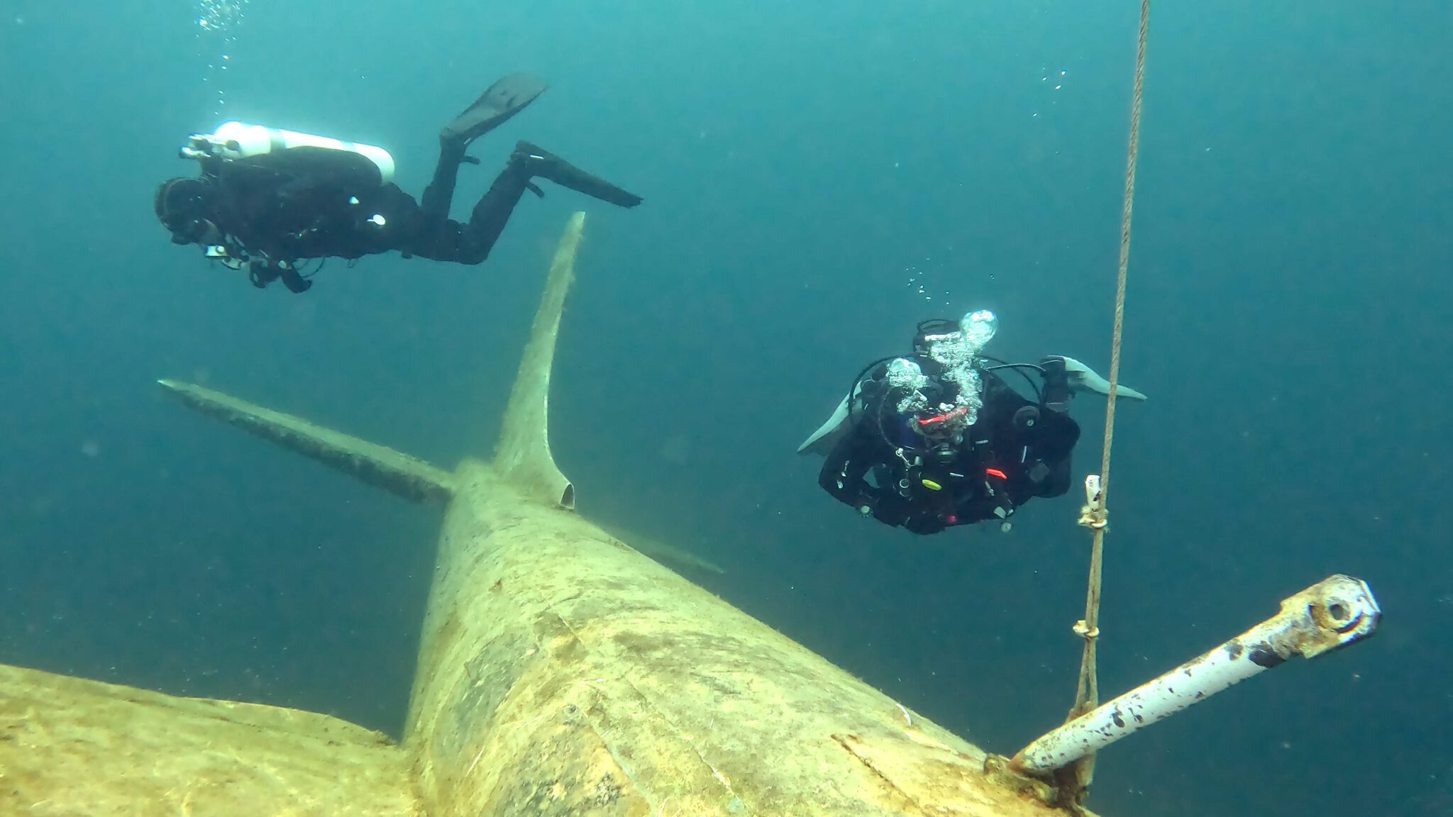 Na een lunch op 1 van de picknickbanken maken we ons klaar voor de tweede duik. Ook nu splitsen we op in buddyparen en gaan we onze eigen weg. Het vliegtuigje hangt er mooi bij en het zicht is ook daar goed. We zwemmen door één van de vele betonnen buizen en duiken langs de afgronden van de steengroeve. De wanden zijn inmiddels prachtig begroeid en er scharrelen vele visjes rond, waardoor het rif-idee wordt versterkt. We zien grote baarzen die stoïcijns door zwemmen en wederom prachtige scholen met schichtige kleine voorntjes. Op de terugweg langs de kant zien we nog een jagende meerkoet die het water induikt, super!